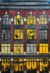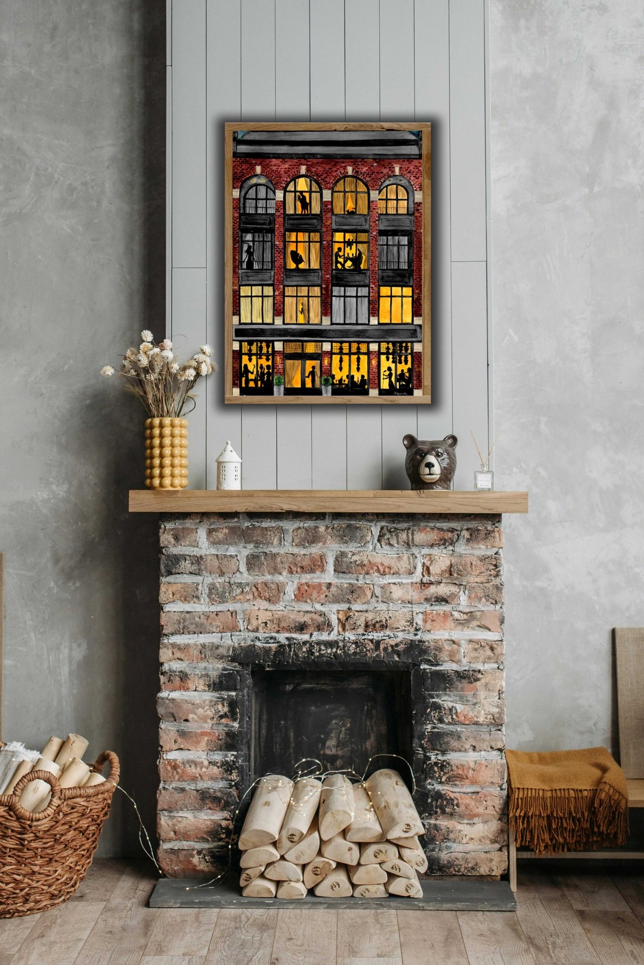 "Nightlife" to oryginalna ilustracja akwarelowa w dużym formacie. Przedstawia elegancką kamiennicę z ciemno bordowej cegły, której fasada ozdobiona jest rzeźbionymi łukami okiennymi i gzymsami w stylu klasycznym. Zanurzona w nocnym półmroku, budowla tętni życiem. W rozświetlonych oknach parteru dostrzeżemy koncert na żywo i bawiących się ludzi. Ciepłe światło przyciąga naszą uwagę i budzi pozytywne skojarzenia. Wyżej, w oknach i na balkonach możemy dostrzec bardziej intymne sceny. Parę w uścisku, ktoś wygląda zza zasłony, ktoś inny pogrążony w zadumie.