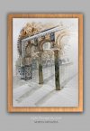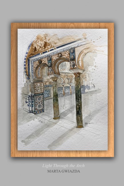 Ta akwarela ukazuje wejście do jednej z sal Alkazaru, uchwycone w lekkiej, szkicowej manierze. Z bieli papieru wyłaniają się misternie rzeźbione kolumny, bogate ornamenty i geometryczne płytki - te same, które pojawiają się w moim obrazie z hiszpańskiej kolekcji zatytułowanym „window of the Alcazar”, lecz tutaj przedstawione z zupełnie inną wrażliwością.