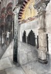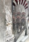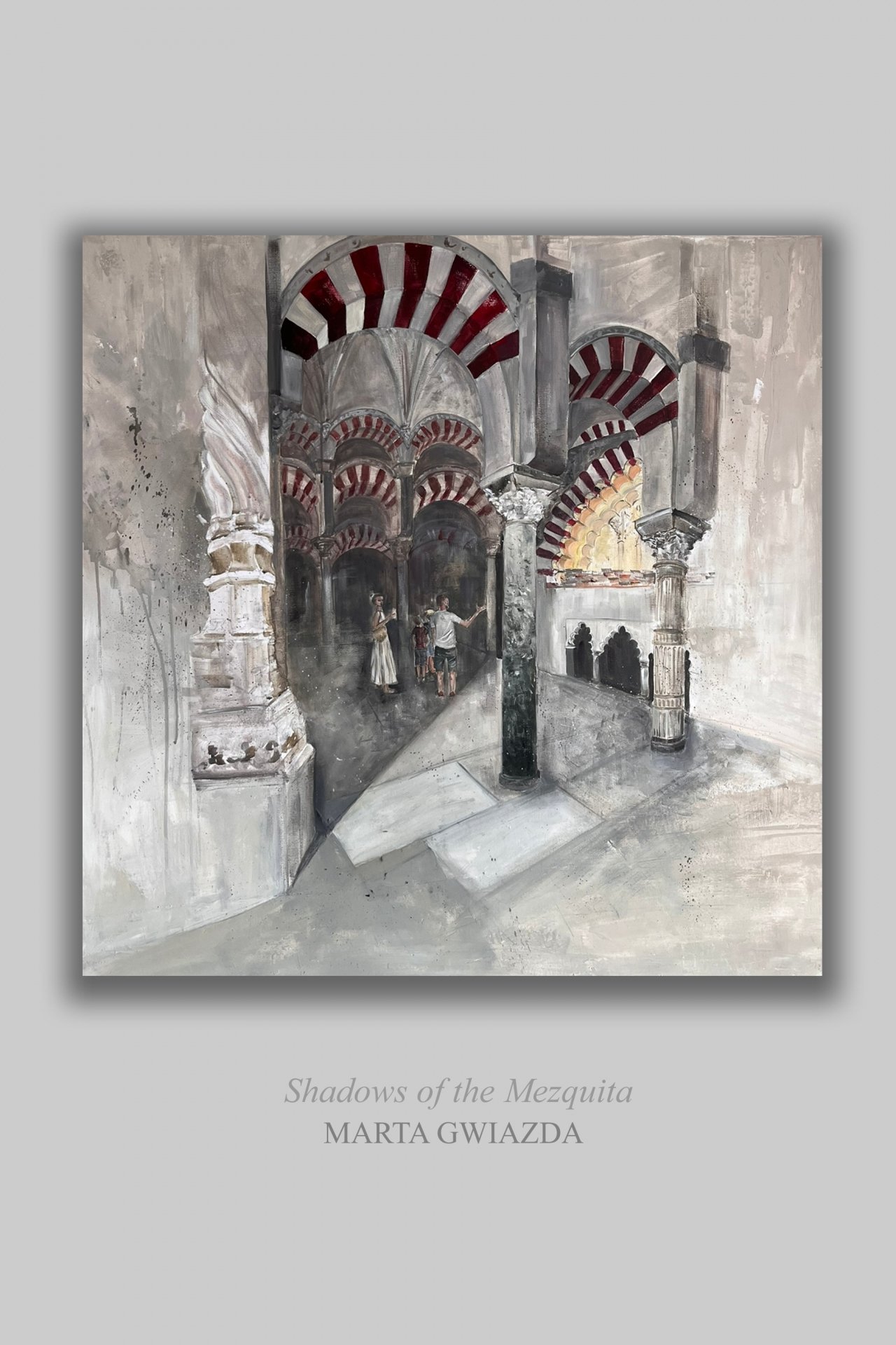 Ten obraz przenosi widza do wnętrza Mezquity w Kordobie - miejsca, w którym przez stulecia przenikały się światy islamu i chrześcijaństwa, tworząc jedną z najbardziej niezwykłych przestrzeni sakralnych na świecie. Na pierwszym planie pojawia się szkicowana, jakby niedokończona kolumna, która działa jak zaproszenie: zachęca, by wyjrzeć zza niej i wejść głębiej w rytm monumentalnych arkad.