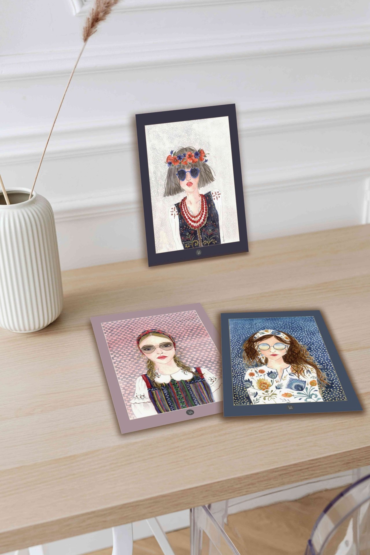 Folkowe dziewczyny to seria ilustracji, które stworzyłam już jakiś czas temu i cieszyły się dużą popularnością. Do tej pory mogliście je kupić w formacie A3. Od teraz możecie je zakupić w serii, wszystkie trzy dziewczyny razem, w drobnym formacie A5. Mogą stworzyć mini galerie plakatów, mogą posłużyć jako kartki okolicznościowe, a oprawione w ramkę wniosą do wnętrza trochę folkowego klimatu.